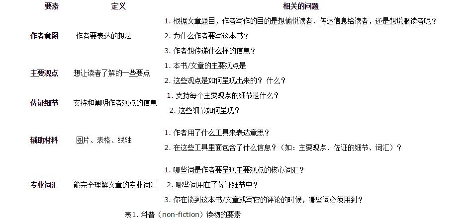 低年级的学生们学习记叙文要了解五个要素:人物、场景、问题、事件和解决。同样,在大多数的科普(non-fiction)读物中也常常出现五个要素:作者意图(the author’s purpose)、主要观点(major ideas)、佐证细节(supporting details)、辅助材料(aids)和专业词汇(vocabulary)。这五个要素的内容和解释,具体可见下表.