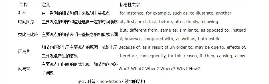 基本的知识性文章一般有五种结构:列举(list)、时间顺序(time order)、类比与比较(compare and contrast)、因与果(cause and effect)、问与答(question and answer)。文章结构反映了作者有组织的表现文章的主要观点和细节,而文章的结构是有据可循的,下面表2就解释了这几种文章结构,并列出了标志性文字和例子。老师可以在课堂分析和讨论中借鉴。